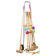 4 crose din lemn mai mici + 2 crose din lemn pentru adulti + 6 mingi + cosulet pentru mingi + carucior de transport + 6 inele metalice + 2 bete din lemn.