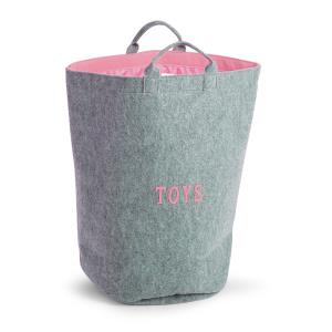 Sac de jucarii XL, cu design rotunjit si fabricat din pasla. Exteriorul sacului este gri, iar interiorul este roz deschis.