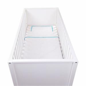 Classic, white sheet (100x150cm) and pillowcase (40x60cm) with a subtle, blue lining.