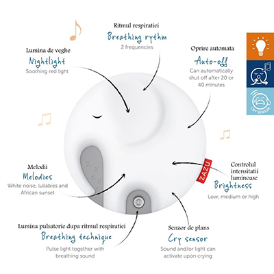 Ascultand sunetul respiratiei si privind cum lumina devine din ce in ce mai mica, micutul tau va urma automat ritmul si va adormi mult mai usor.